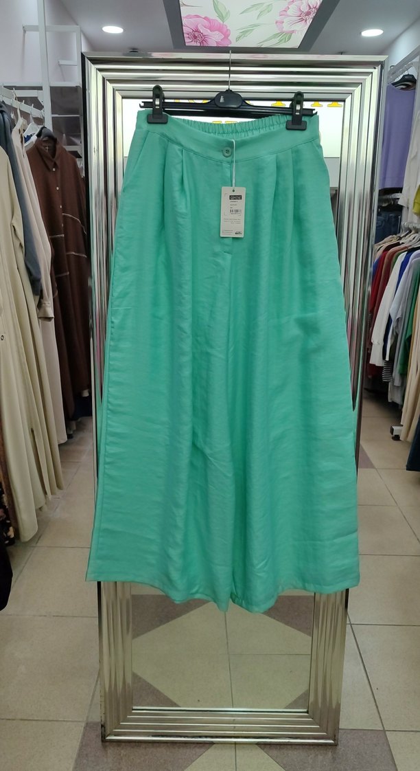 Kadınlar için pastel yeşil renkte, pilili ve salaş kesim uzun pantolon. Yumuşak, ipeksi dokusu ve minimal normcore tarzı ile günlük kullanıma uygun. turkuaz renk arkası lastik ürün mağaza ürünüdür 36_38 & 40_42 & 44_46 uyumlu bedenleri mevcut