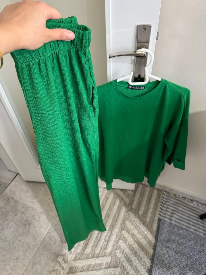 Kadın için koyu yeşil, salaş kesim takımdır. Kısa kollu ve bisiklet yaka, yumuşak keten kumaştan yapılmıştır. Desensiz ve rahat şık tarzda.