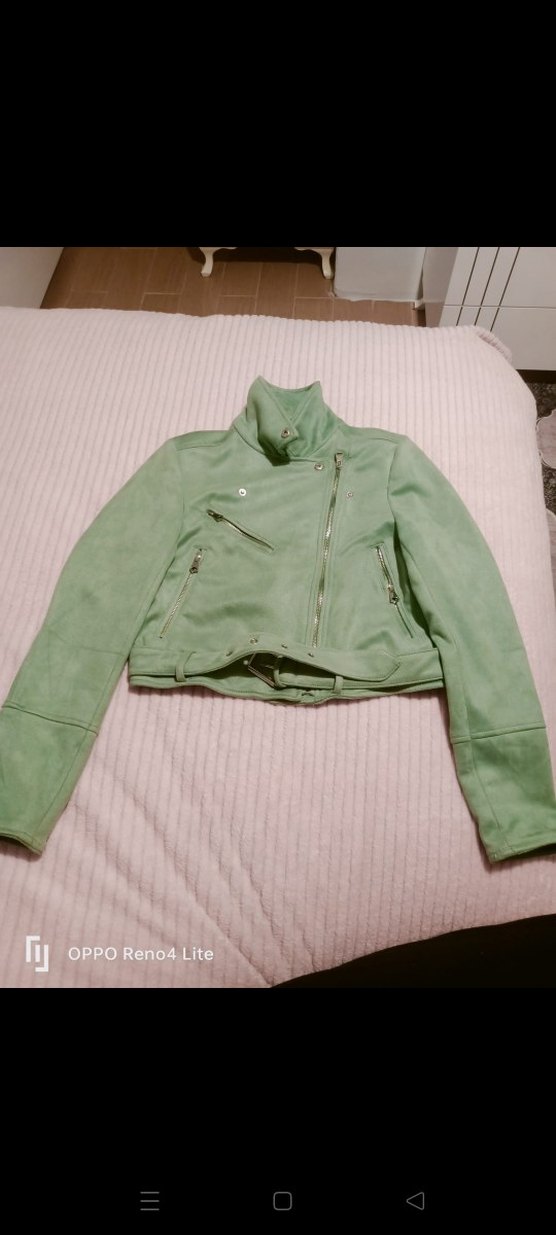 Yeşil süet kumaştan, kemerli ve yüksek yakalı, uzun kollu, günlük kullanıma uygun, sade ve şık kadın deri ceket. mex 28 sorunsuz
