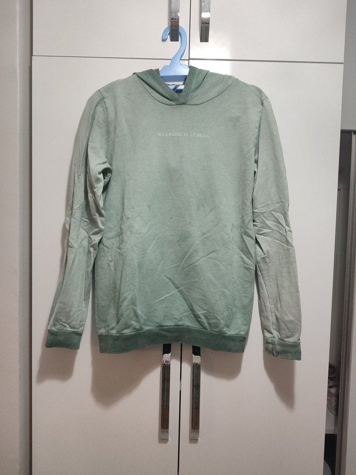 Kadınlar için uzun kollu, bisiklet yaka ve bol kesim yeşil süet sweatshirt. Desensiz, günlük rahat kullanıma uygun şık tasarım. birkaç defa giyildi tertemiz