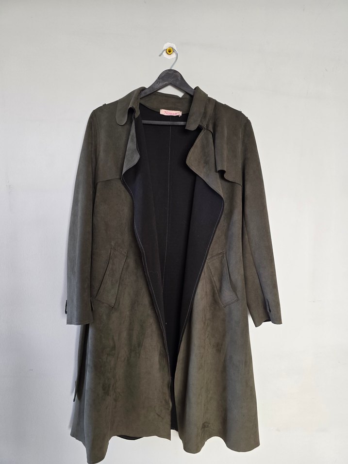 Uzun boy yeşil süet trençkot, yakalı ve kemerli bel detayıyla rahat bir kesim sunar. Uzun kollu, desen içermeyen günlük stil için uygundur.