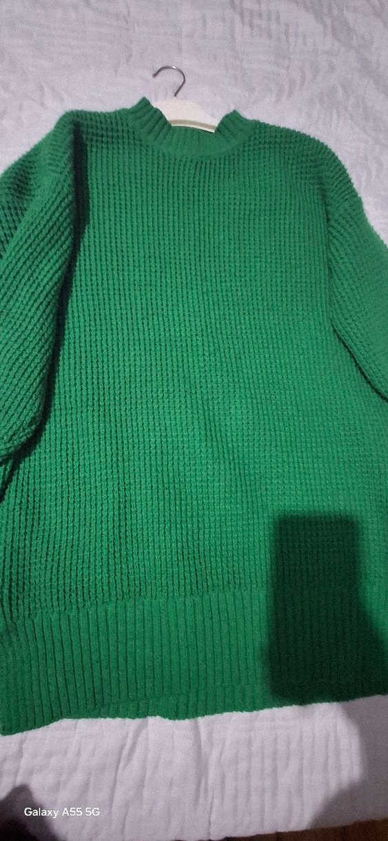 Kadınlar için yeşil, parlak renkte, bisiklet yaka, uzun kollu, triko kumaştan yapılmış, vücuda oturan normal uzunlukta kazak. m l xl olur sıtandart beden