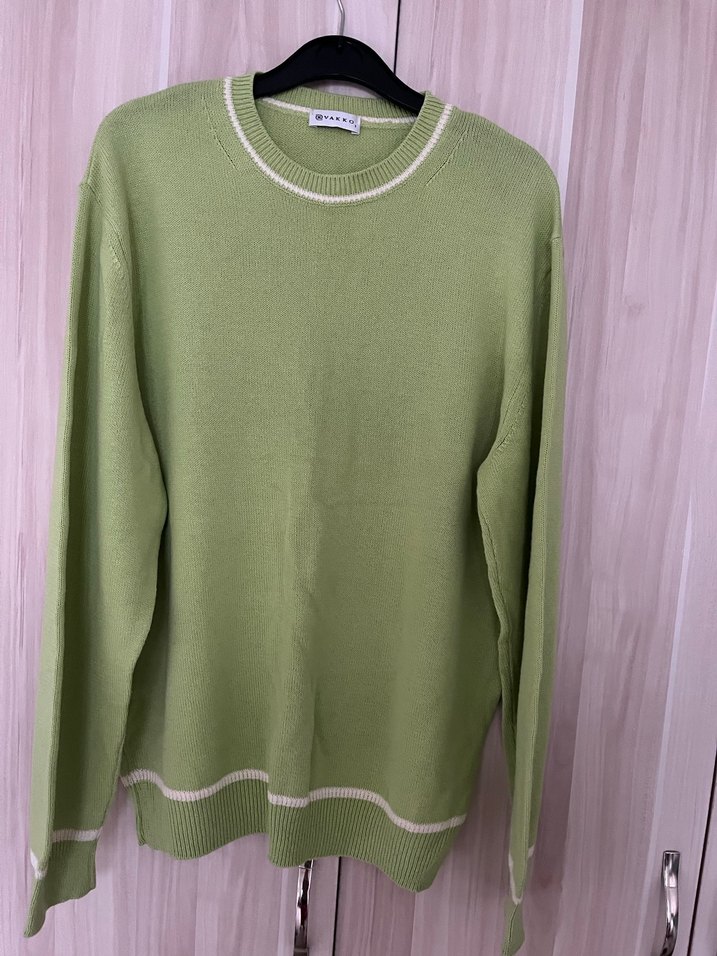 yeşil renkte, bisiklet yaka ve uzun kollu örme triko kazak. Rahat ve bol kesim, gündelik sokak stili için uygun.