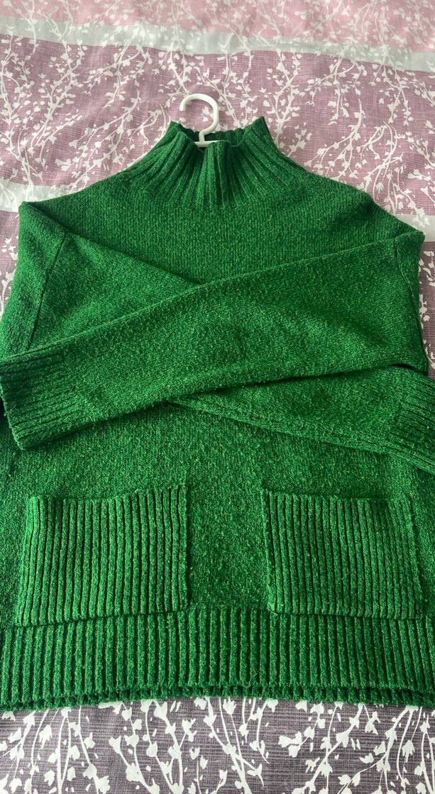 Yeşil triko boğazlı kazak, uzun kollu ve bol kesimdir. Düz ve parlak dokusu, iki ön cep içerir, günlük kullanım için uygundur.
