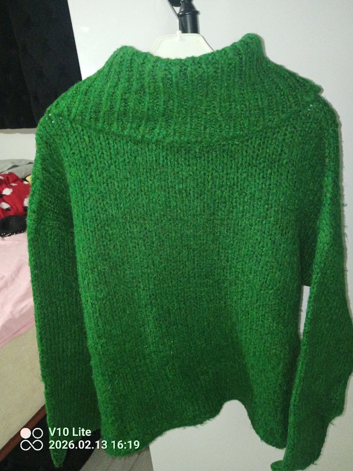 Yeşil renkte, boğazlı ve uzun kollu, triko örgü kadın kazak. Salaş kesimi ve parlak dokusu ile gündelik kullanıma uygundur. tanesi 100-150 arası l lx bedenler karışık
