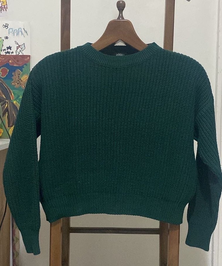 Koyu yeşil renkte, yuvarlak yaka ve uzun kollu, triko örgüden yapılmış salaş kesim bir kazak. Günlük rahat sokak stili için uygundur.