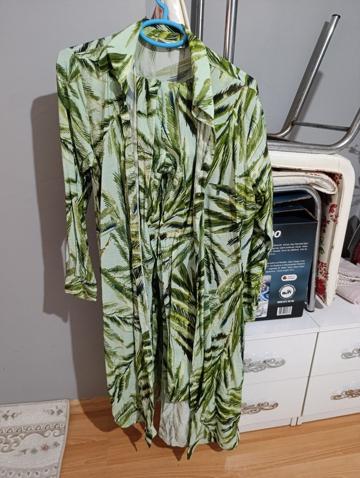 Kadınlar için uzun boy, bol kesim, uzun kollu ve yeşil batik desenli bohem tarzında bir takım Hafif canlı renktedir.