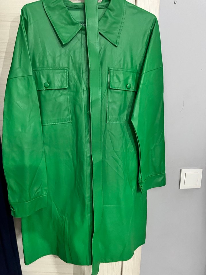 Kadın yeşil uzun deri ceket, kemerli ve bol kesimlidir. Uzun kollu ve kesik yaka detaylıdır. Parlak yüzeyli, cep kapaklı, günlük kullanıma uygundur.