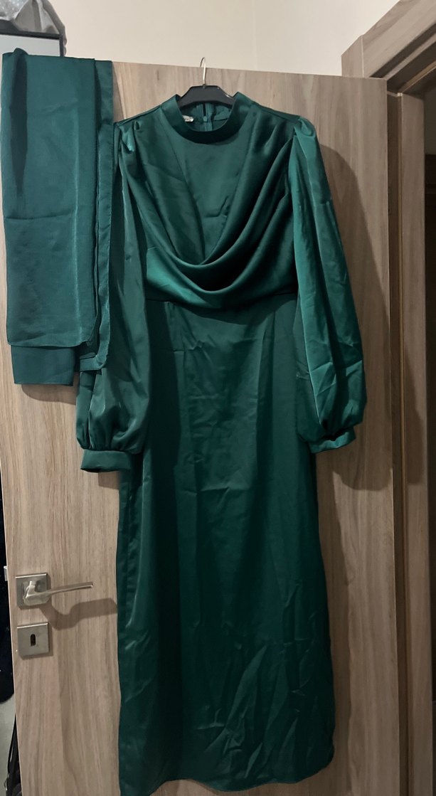 Yeşil renkte, uzun boyda, drapeli ve yüksek yakalı, satenimsi kumaştan yapılmış kadın elbisesi. Uzun kollu ve rahat kesim, ofis için uygun modern klasik stil.aynı ton şal dahil