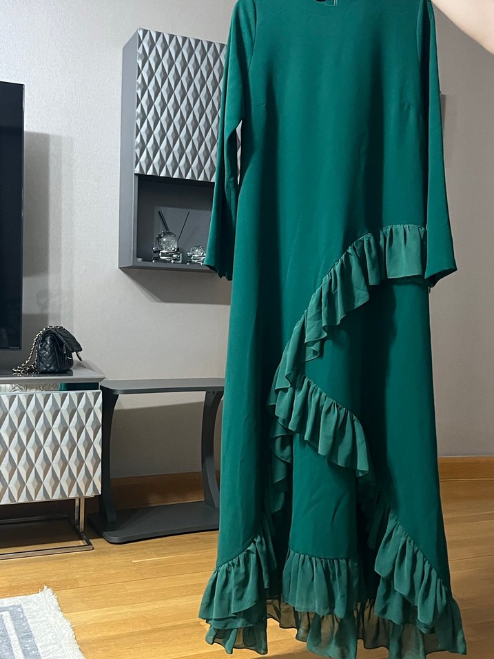 Kadınlar için tasarlanmış yeşil uzun elbise, bol kesim ve fırfır detaylara sahiptir. Krep yumuşak kumaştan üretilmiş, yuvarlak yaka ve uzun kolludur.