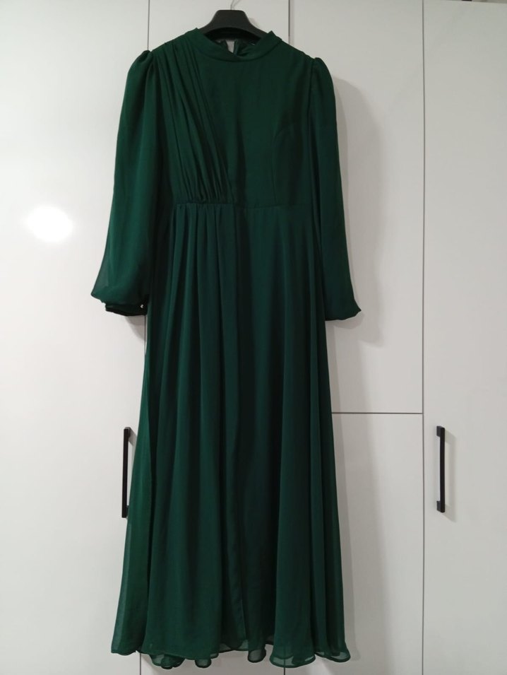 Kadınlar için koyu yeşil, uzun kollu, yüksek yakalı, bol kesim ve drapeli tasarıma sahip uzun elbise. Yumuşak şifon kumaştan,vintage ve modern klasik tarzda. Dökümlü ve astarlıdır.