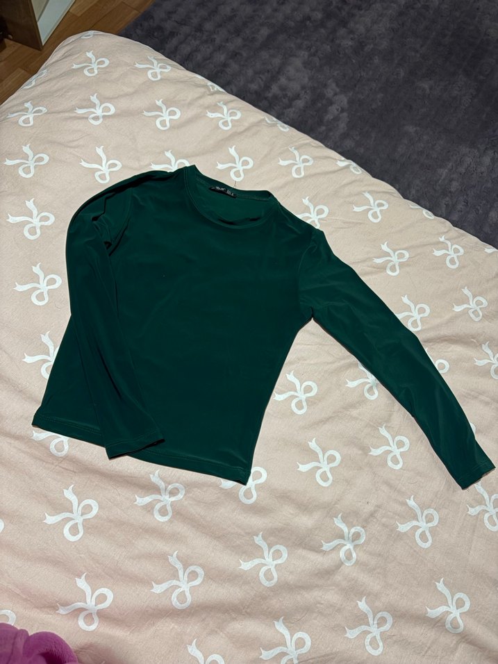 Kadınlar için fitted kesim, uzun kollu ve balıkçı yakalı, yumuşak ve sıcak kumaştan yapılmış koyu yeşil tişört.