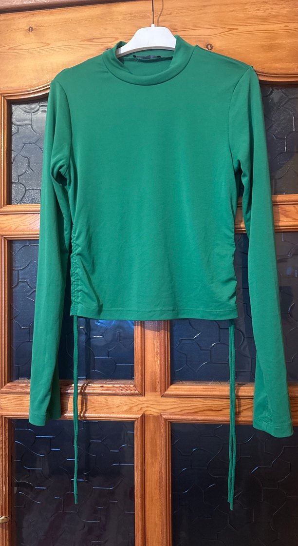 Kadınlar için yeşil, uzun kollu ve bisiklet yaka, vücuda oturan tişört. Pürüzsüz sentetik kumaştan, rahat dış mekan kullanımı için uygun, trend ve rahat stil sunar.