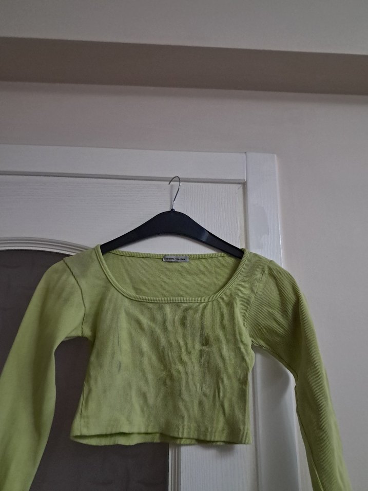 Kadınlar için yuvarlak yakalı ve uzun kollu, yumuşak keten kumaştan yapılmış crop top. Bol kesim ve midi boyda, minimalist sokak tarzı için uygun. Düz yeşil renkte, günlük kullanıma uygun.