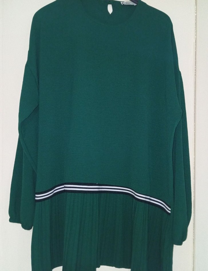 Uzun kollu, yuvarlak yakalı, pileli uzun kesim yeşil tunik. Rahat sentetik kumaştan, günlük kullanıma uygun.