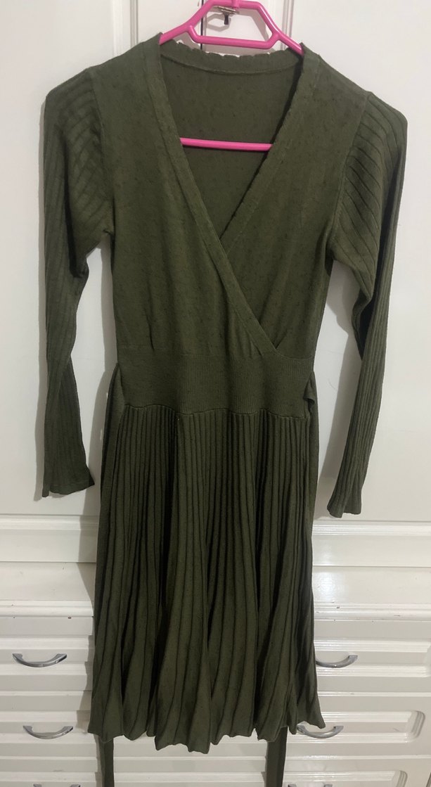Bu koyu yeşil triko elbise uzun kollu, 38 beden V yakalı ve piliseli tasarıma sahiptir. Yumuşak sentetik kumaştan yapılmış, modern klasik ve rahat bir görünüm sunar.