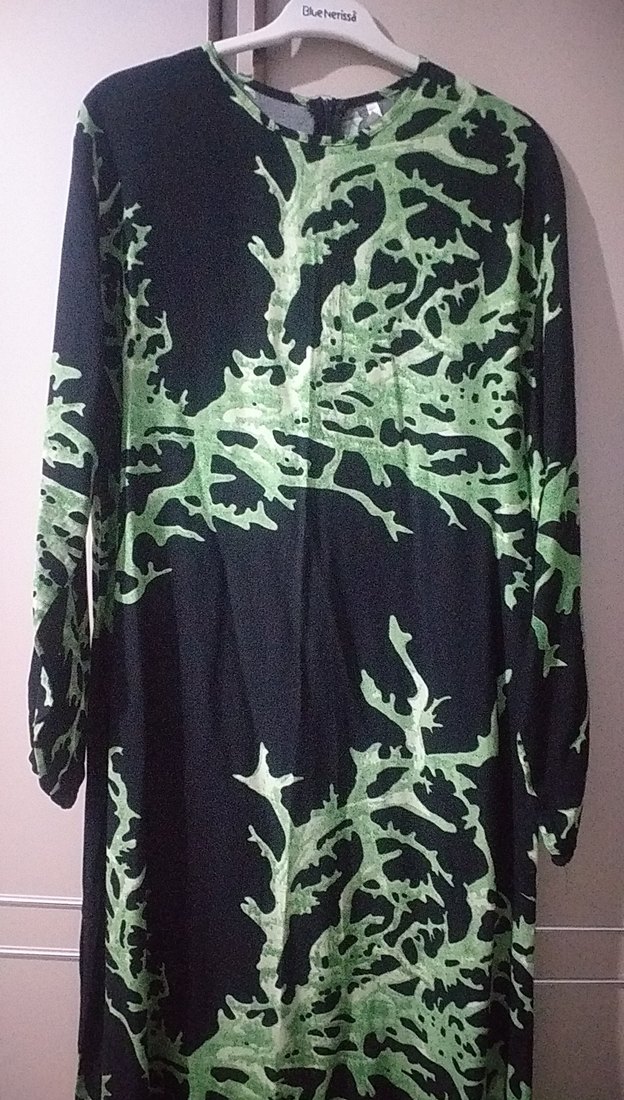 Kadınlar için uzun kollu, salaş kesim, yeşil tonlarında tie-dye desenli, drapeli uzun elbise. Goth ve avant-garde tarzda, dış mekan kullanımı için uygun.