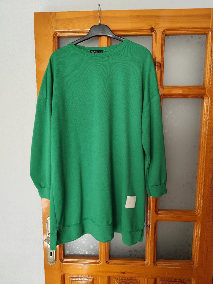 Yeşil uzun kollu, yuvarlak yakalı ve salaş kesimli tunik. Yumuşak ve sıcak kumaştan, parlak görünüme sahip, rahat günlük sokak stili için uygundur.