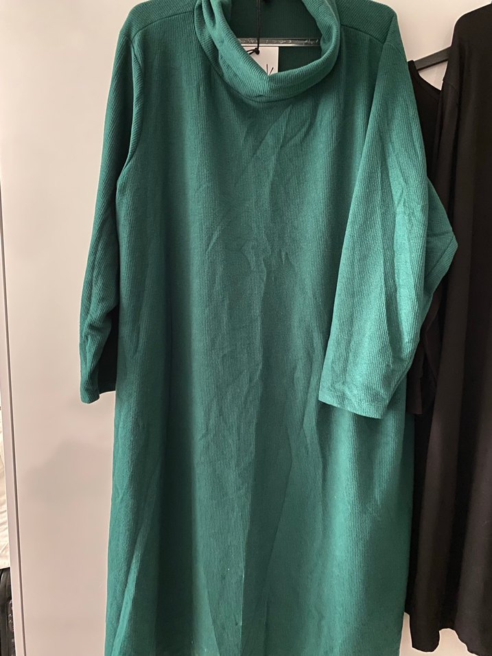 Kadınlar için yüksek yakalı ve uzun kollu, bol kesim triko elbise. Keten kumaştan, drapeli tasarıma ve koyu yeşil renge sahiptir, günlük kullanım için uygundur. 58-60 bedene uyumlu ölçüler görsellerde var yurt dışı ürünü(marka temsili)