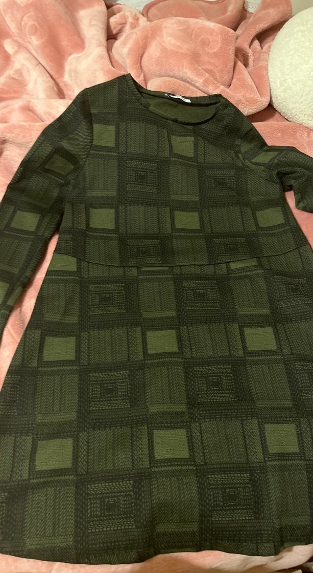 Dar kesim, uzun kollu kadın triko elbise, yumuşak sentetik kumaştan, koyu yeşil ve geometrik desenli, sokak stili için uygun.