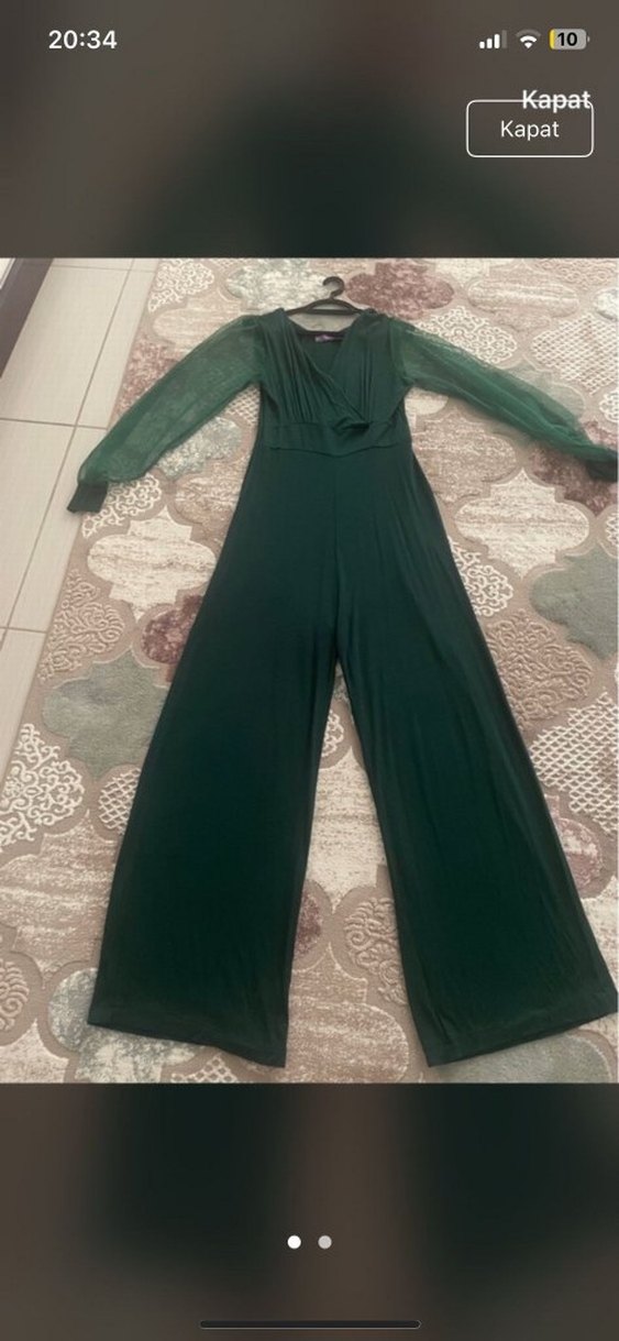 Koyu yeşil, uzun kollu, v yaka ve drapeli, yumuşak sentetik kumaştan yapılmış kadın tulumu, parti için uygun.