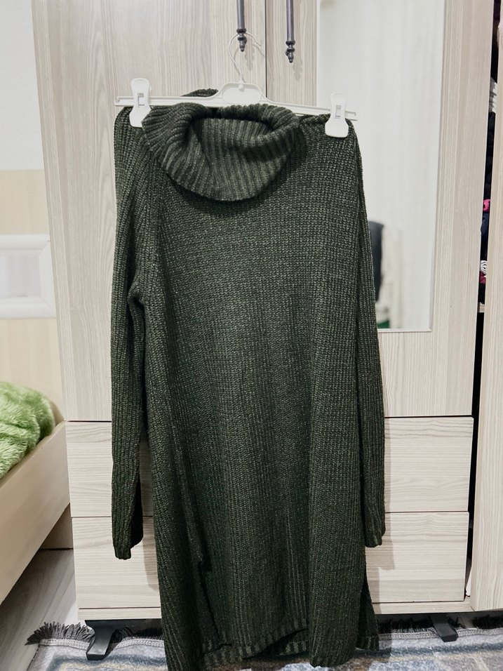 Yeşil renkli, uzun kesim ve bol kalıplı kadın kazak. Örgü dokusu, balıkçı yaka ve uzun kollu, rahat sokak stili için uygundur. Hiçbir sorunu yoktur