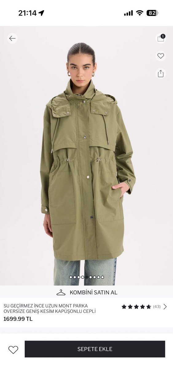 Geçen kış aldım bir kere giydim bana büyük geliyor kalıbı biraz geniş sırt ayarında İki koltuk arası 60 cm boy 90 cm Mevsimlik bir kumaşı var kalın değil