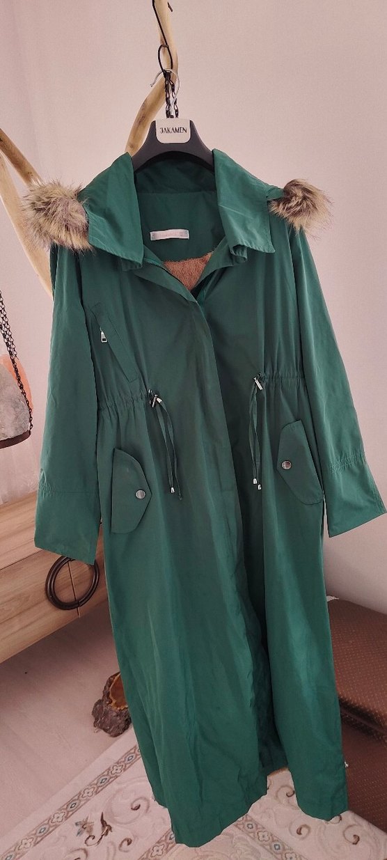 Merhabalar yeşil rekte notched lapel yakalı ve uzun kollu kadın parka. Rahat kesim ve sentetik kumaştan yapılmıştır. Benetton yeşili renginde mont, içi kürklü, 40 beden, hiçbir sorunu yoktur. Alana hayırlı olsun.