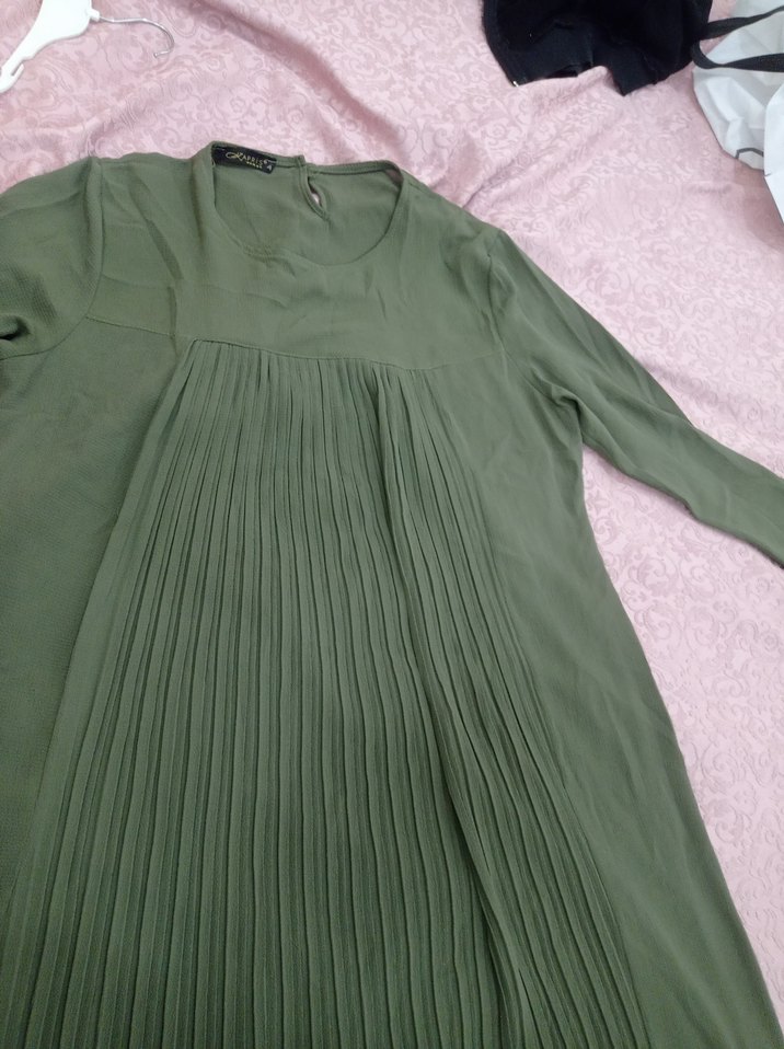 Kadınlar için uzun, keten kumaştan yapılmış, bol kesim, uzun kollu ve yuvarlak yakalı pilili ön kısmı olan pastel yeşil elbise. 46 bedendir tunik boyundadır yaklaşık olarak dizlere gelir bol kesim rahattır