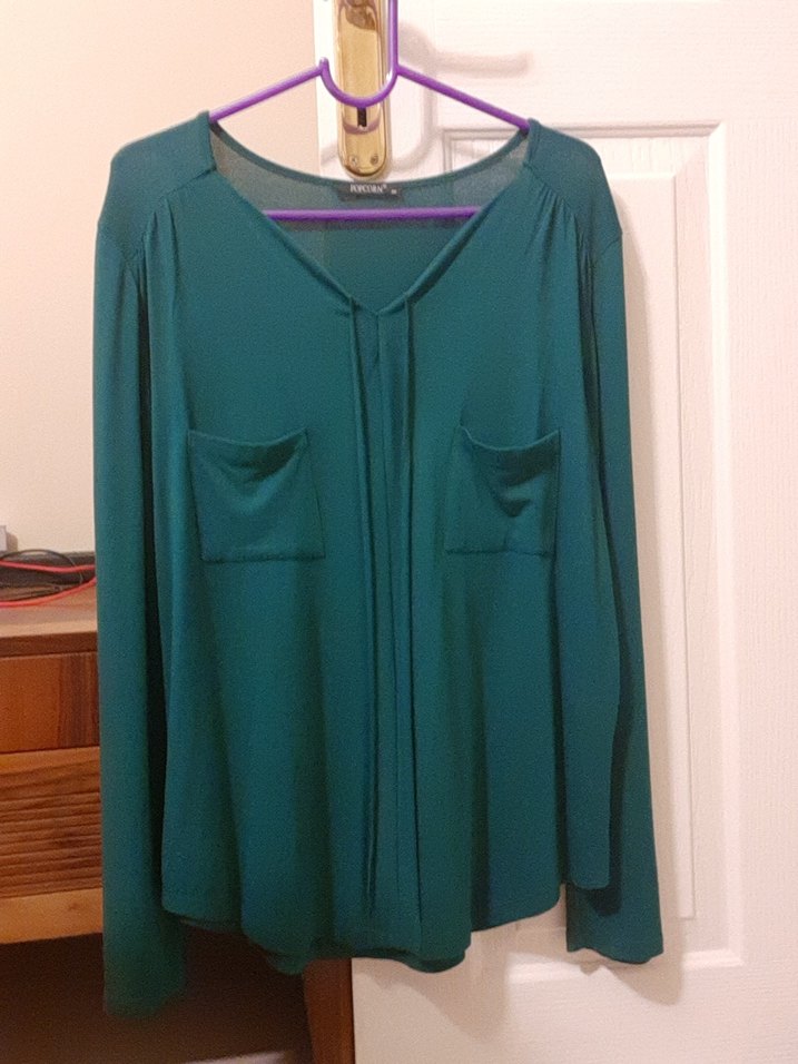 Koyu yeşil renkte, V yaka ve uzun kollu kadın gömlek. Salaş kesimi ve drapeli yapısıyla ipeksi dokuda, minimal ve bohem tarzda gündelik kullanıma uygun.