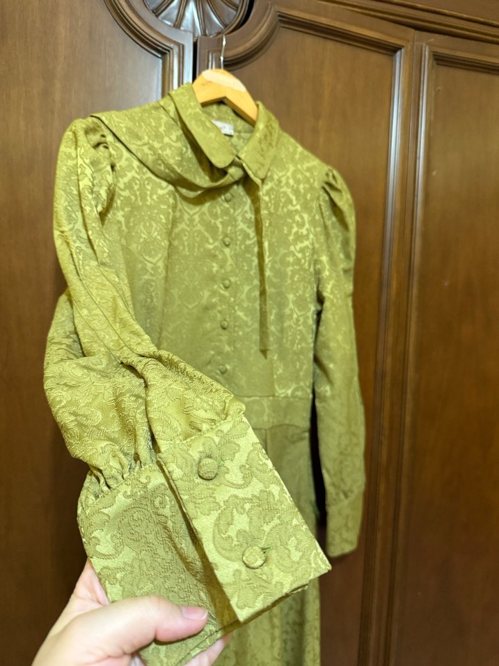 Ümraniye Çarşı’dan aldım.Vintage tarzda kadın elbisesi, parlak yeşil renk ve desenli. Yakalı, düğmeli, uzun kollu. Kumaşı ipeksi ve yumuşak hissedilir.