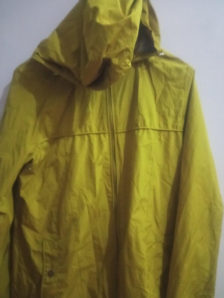 yeşil yağmurluk sentetik kumaştan yapılmış, kapüşonlu ve fermuarlı midi yağmurluk. Yüksek yakalı, uzun kollu ve bol kesimdir. ️