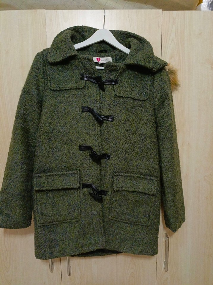 Yün kumaştan yapılmış,-yeşil tonlarında, kürk detaylı ve kesik yakalı, bol kesim kaban. Sokak modasına uygun sade tasarım.