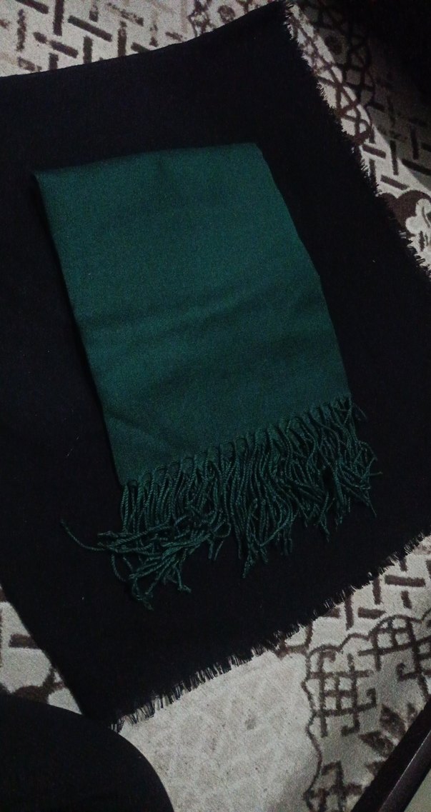 Koyu yeşil renkte, yün kumaştan yapılmış, püsküllü kadın şalı. Rahat ve sade bohem tarzıyla sıcak tutar.