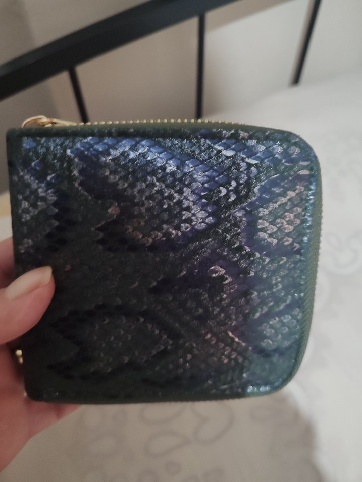 Koyu yeşil renkte, yılan derisi desenli ve fermuarlı deri kadın cüzdanı, bohem ve Parisli avant-garde tarzını yansıtıyor.