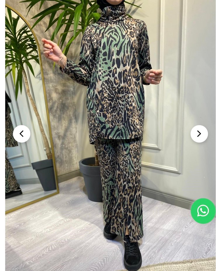 Kadınlar için koyu yeşil yılan desenli, uzun ve salaş kesim takım. Boğazlı yaka, uzun kollu ve pile detaylı, yumuşak sentetik kumaştan günlük kullanım için uygun.