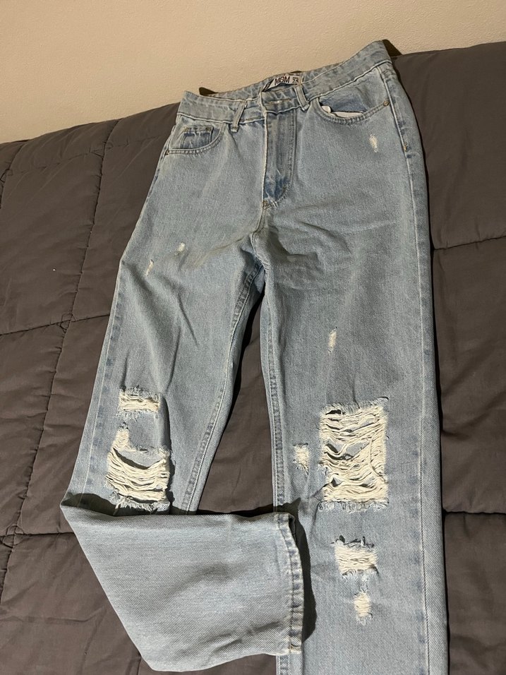 Açık mavi yırtık detaylı ve kemerli bel kısmına sahip bol kesim kadın denim pantolon.günlük kullanıma uygun rahat stil. Markasını bilmiyorum bi butikten alındı