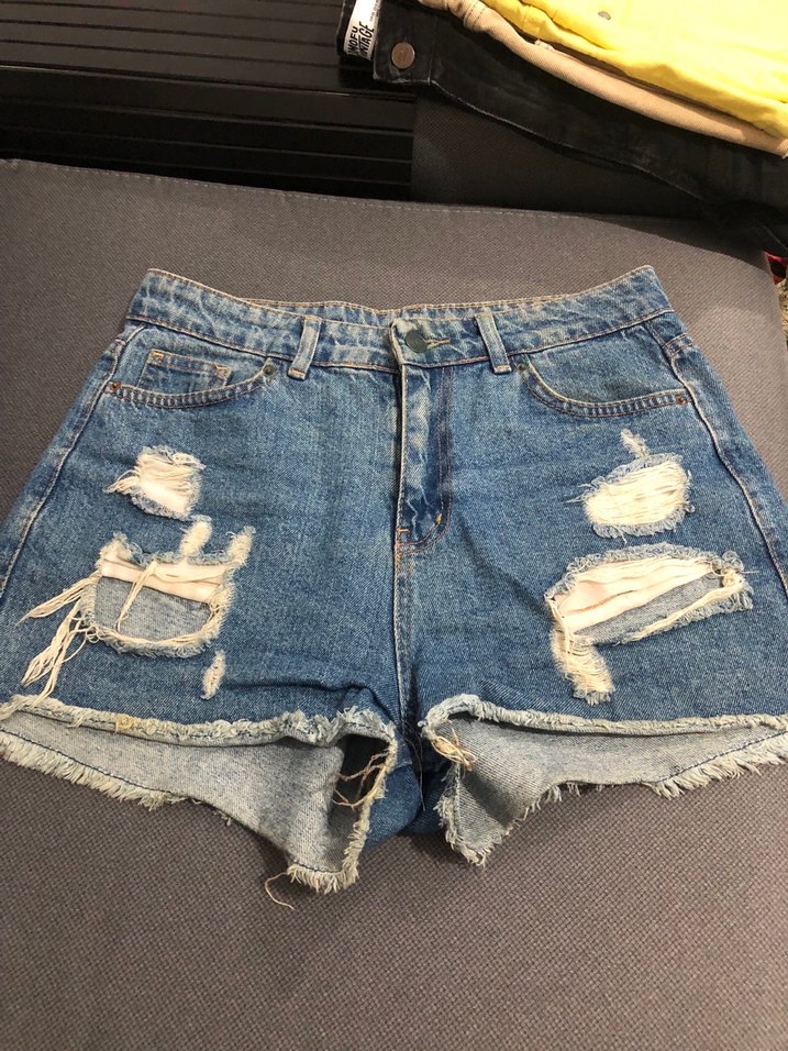 Bol kesim, yırtık detaylı, tokalı kadın kot şort. Mini boy ve rahat sokak stili, mavi renkte.