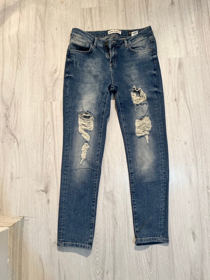 Yırtık detaylı, rahat kesim, normal boy mavi denim pantolon, günlük kullanıma uygun sokak stili için tasarlanmıştır.