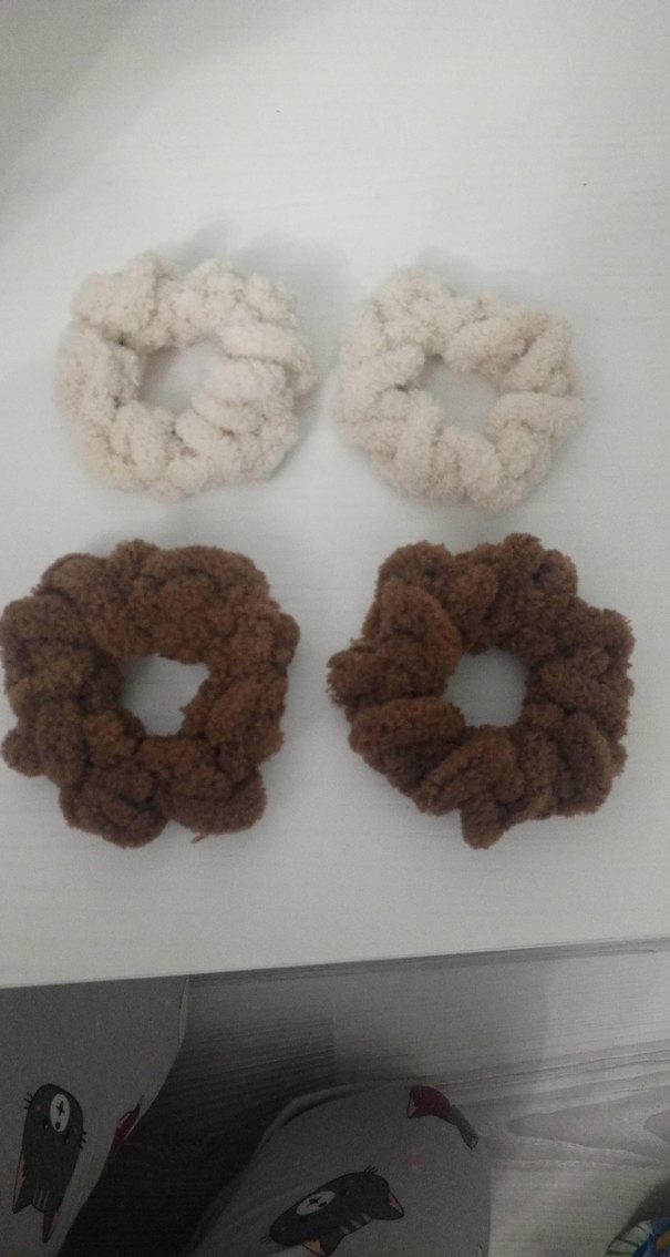 Kahverengi ve krem tonlarında, yün örgüden yapılmış dörtlü saç tokası seti, bohem tarz için uygundur.