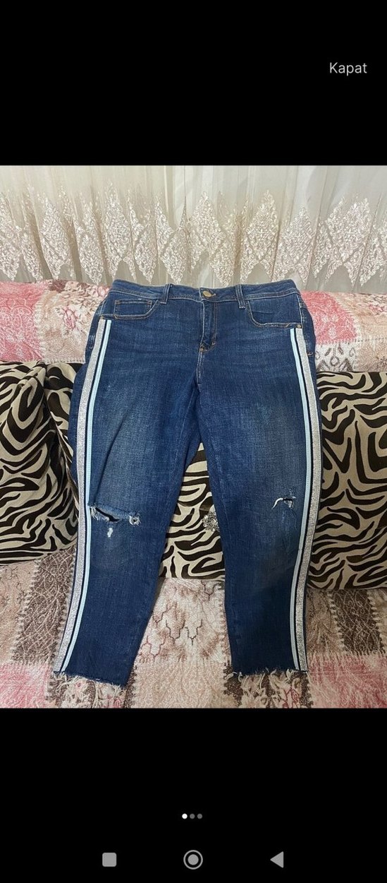 Günlük kullanıma uygun, mavi ve gri tonlarda zebra desenli, bol kesim midi uzunlukta kot pantolon.