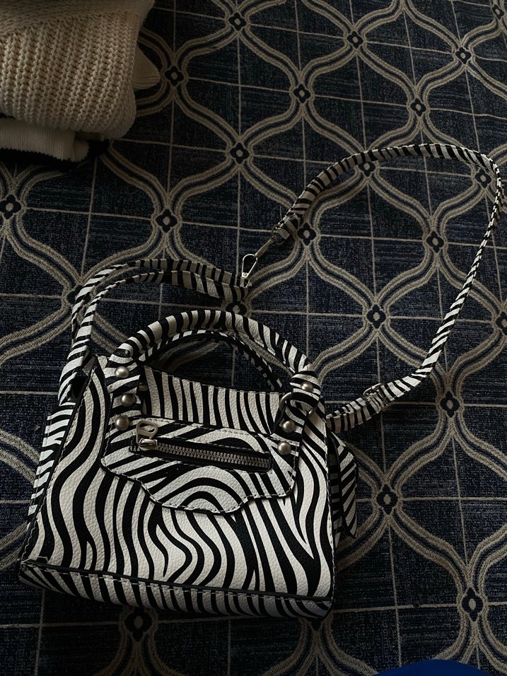 Kadınlar için siyah ve gri zebra desenli, tokalı deri omuz çantasıdır. Günlük kullanıma uygun çağdaş avangard stile sahiptir.