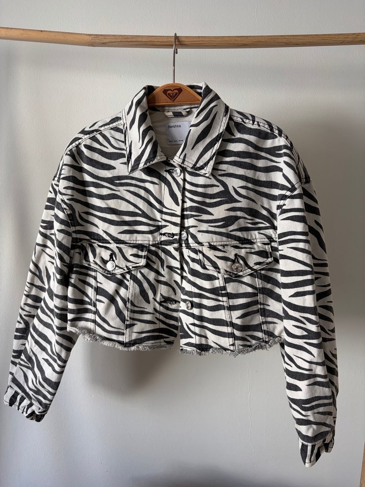 Kadın zebra desenli mini kot ceket, uzun kollu ve düğmeli. Çok az kullanıldı. Yakasında çok az bir leke var belli olmuyor. Ürünlerimi temiz teslim ediyorum