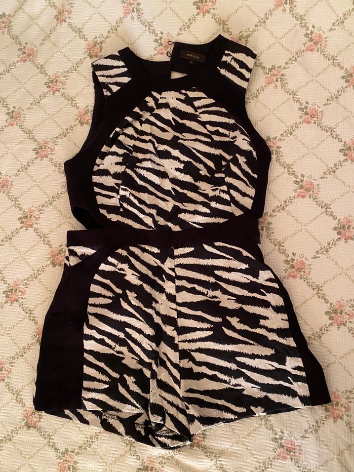 vücuda oturan siyah-beyaz zebra desenli mini tulum.