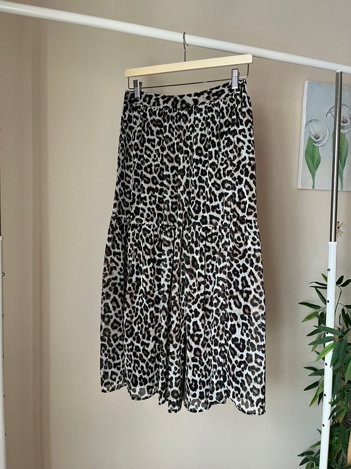 Kadınlar için kahverengi-gri zebra desenli, sentetik kumaştan pilili ve bol kesim uzun etek. Bohem ve minimal stil için uygundur.