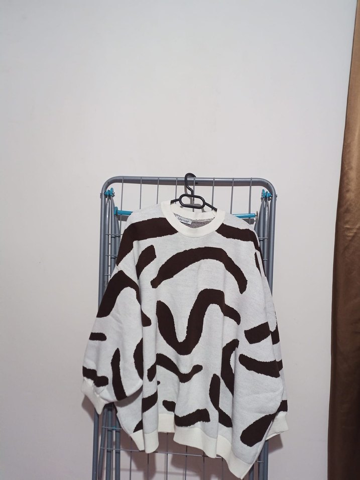 Kadınlar için zebra desenli, uzun kollu, bisiklet yakalı triko sweatshirt. Triko kumaştan örülmüş, bol ve normal boyda, günlük kullanım için uygundur. Gri ve beyaz minimalist tarzda.