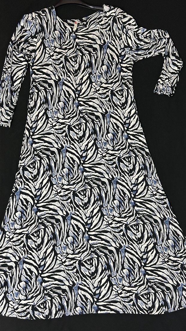 Zebra desenli, uzun kollu ve bisiklet yaka kesime sahip kadın elbisesi. Etek ucuna doğru genişleyen model. L beden. Kemer takmak isterseniz takılır kemer askısı yanlarında mevcut. Hiç giyilmedi.