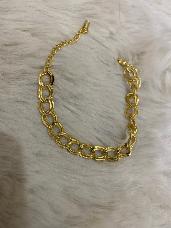Parlak altın renkli, detaylı halkalara sahip el zinciri. Bohem ve gösterişli tarzda, günlük kullanıma uygun. ✨