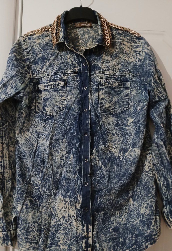 Bu mavi denim gömlek, batik desen ve yakada zincir detayları içerir. Salaş kesim, uzun kollu ve yakalıdır, trend görünüme uygundur Ürün 1 kere giyilmiştir gayet iyi durumdadır Alan kişiye Hayırlı Olsun