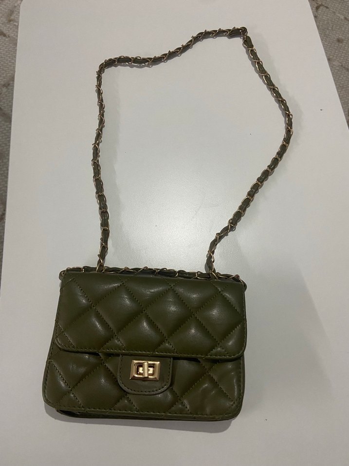 Zincir detaylı, yılan desenli haki deri çanta, günlük kullanım için şık ve trend sokak stili uyumlu.